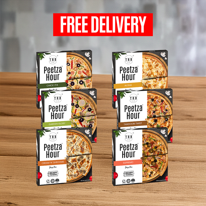 The Celebration Bundle brings you 6 read-to-bake large pizzas: Chik-ita, Supremo, Tandoori Twist, Aloha, Cream 'N' Shrooms & Garden Glory. Perfect for any celebration!