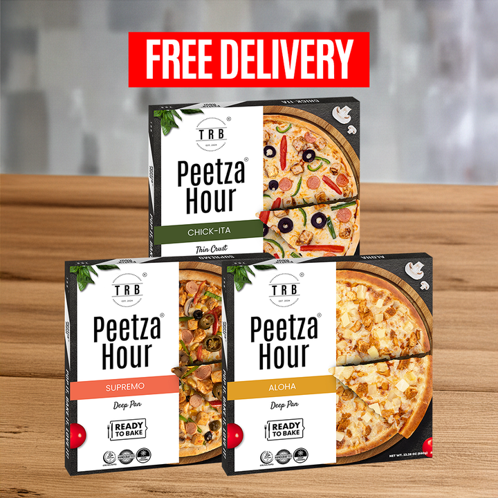 Triple the flavor, triple the fun! Enjoy Supremo, Aloha, and Chiki-ta—three large, ready-to-bake pizzas, fresh from your oven.